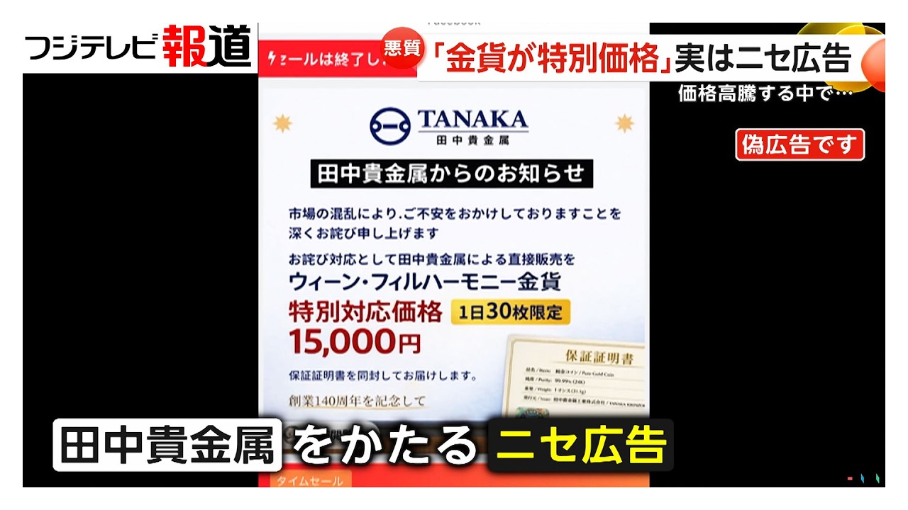 偽広告は金取引大手・田中貴金属をかたり、金貨の販売キャンペーンを行っているというもの。