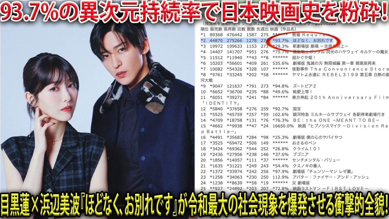 目黒蓮と浜辺美波が主演する『ほどなく、お別れです』が前週比わずか93.7%という異次元の数字で日本映画史を塗り替える中、令和最大級の感動作として社会現象を巻き起こし続けている圧倒的な全貌