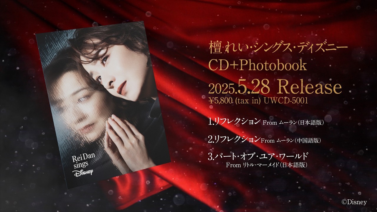 檀れいが歌うディズニーの名曲を収録した『檀れい・シングス・ディズニー』が2025年3月21日(金)にデジタル配信、5月28日(水)にCDでリリース。ディズニーの名作アニメーション映画『ムーラン』から「リフレクション」の日本語版 、そしてその実写版からは同じく「リフレクション」の中国語版主題歌、更にはディズニーアニメーション『リトル・マーメイド』から「パート・オブ・ユア・ワールド」の3曲を檀れい自身が選曲した、ディズニー公式のカバーシングルです。ジャケットは写真家 十文字美信が撮影した「リフレクション」の世界観を表した撮り下ろしの一枚。CDは各収録楽曲からインスパイアされた世界を表現した写真が掲載された特製フォトブックとセットになった特別な一作。音楽と共に、美しい写真の数々からも『檀れい・シングス・ディズニー』の世界をお楽しみください。