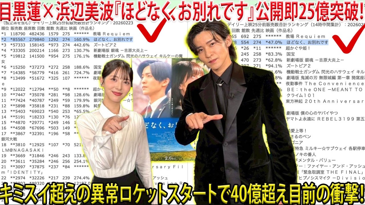目黒蓮と浜辺美波がW主演の純愛映画『ほどなく、お別れです』が公開直後に異例のロケットスタートを切り、興行収入25億円を突破!「君の膵臓をたべたい」を超える勢いで、40億円超えも現実味を帯びる大ヒットが目前に迫る衝撃のスタートダッシュを徹底解説。