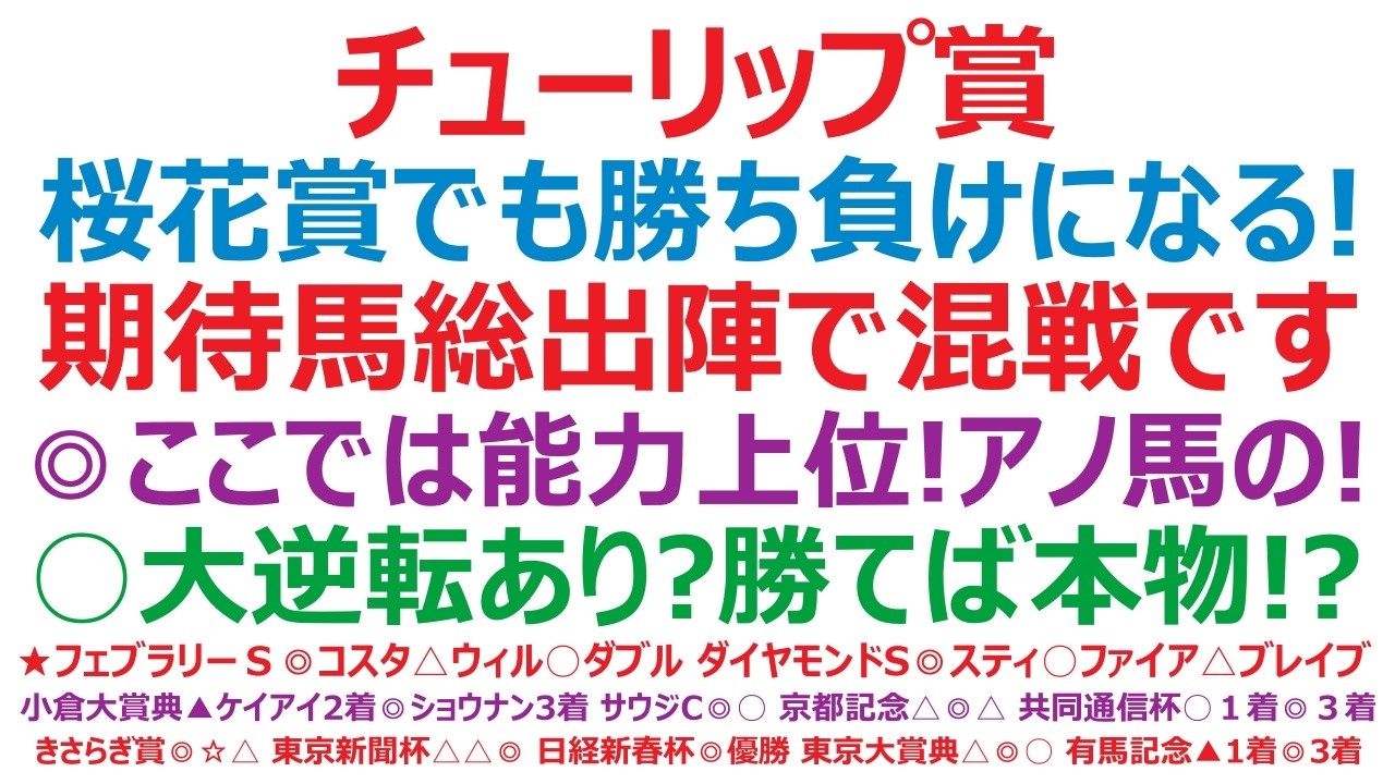 Share Facebook Twitter Pinterest LinkedIn チューリップ賞2026予想 桜花賞でも勝ち負けになる!期待馬総出陣で混戦です。◎ここでは能力上位!アノ馬の!○大逆転あり!?勝てば本物です。 チューリップ賞2026の予想です。 桜花賞で優勝もある馬たちが登場。一番乗りはどの馬か?前走以上の走りが期待できる◎この馬が中心。一連の成績から、能力上位は明らかです。 #チューリップ賞 #タイセイボーグ #アランカール NEWSアランカールソルパッサーレタイセイボーグチューリップ賞桜花賞予想