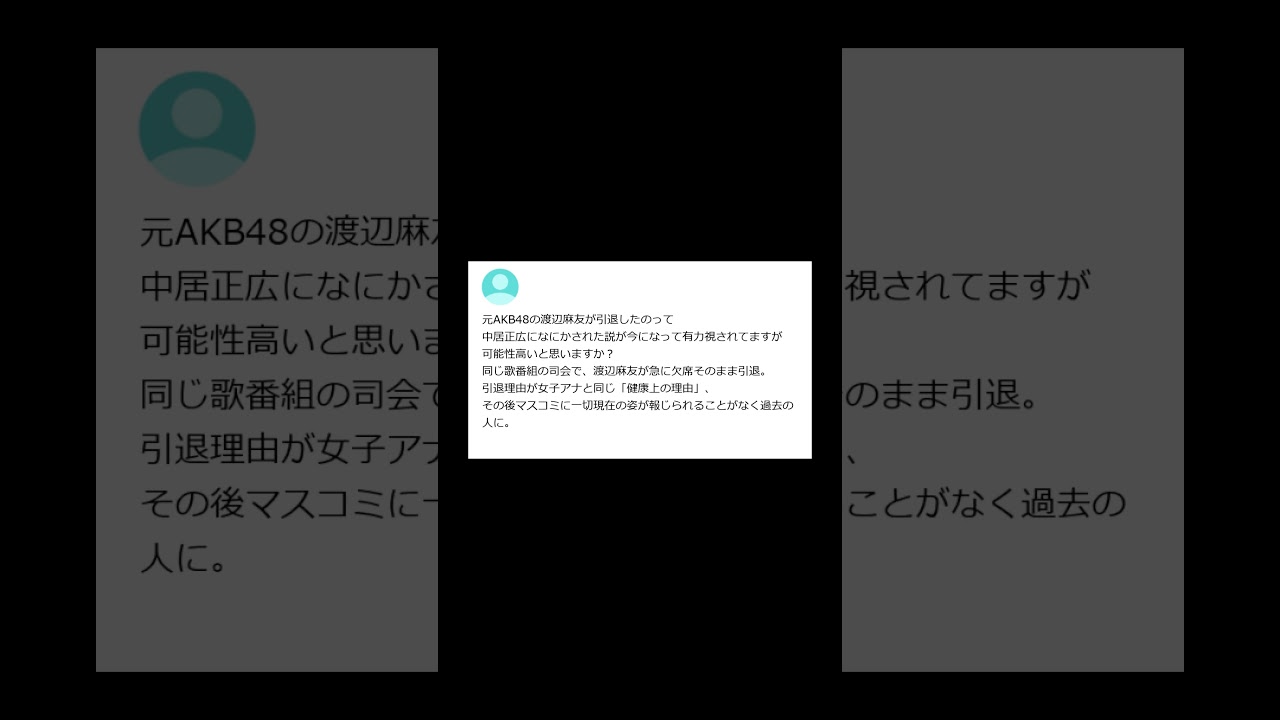 【ヤフー知恵袋】「元AKB48渡辺麻友の引退理由は中居正広との関係?闇が深い説に真相は?」→ 話題の噂に注目が集まる質問www #shorts #ヤフー知恵袋 #知恵袋 233 #Yahoocelebrityちえぶくろヤフーやほお渡辺麻友