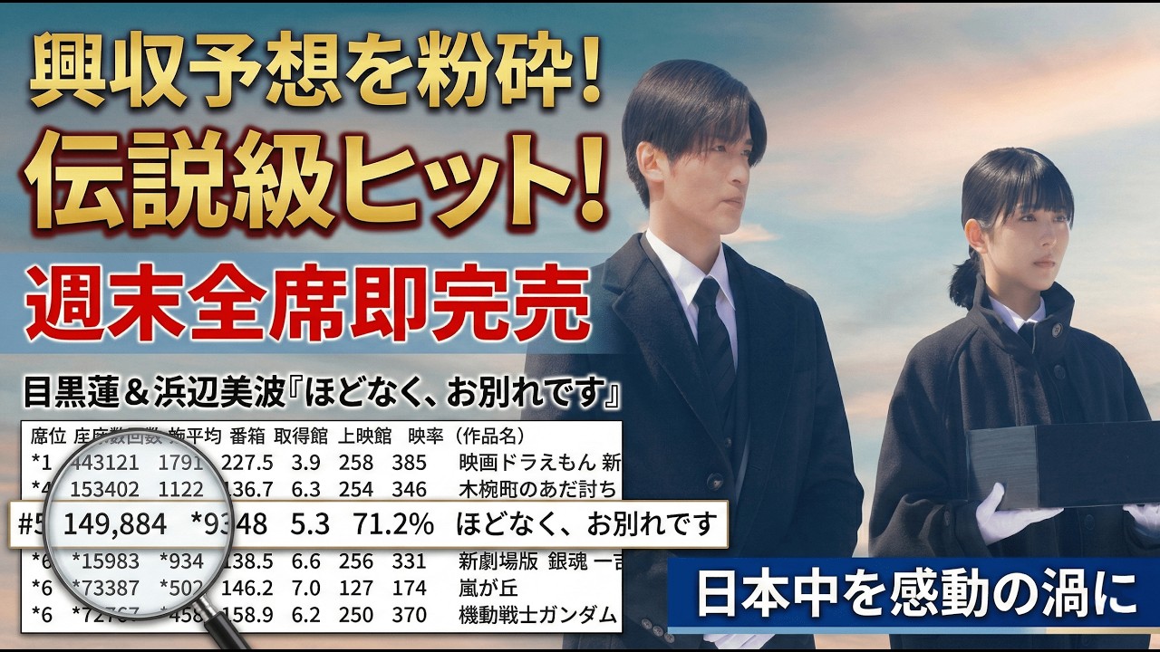 この動画では、目黒蓮と浜辺美波が織りなす感動の映画『ほどなく、お別れです』の驚異的な興行成績を深掘り!予測を覆す歴史的な観客動員、週末全回完売の異例事態、そして全国を涙で包む舞台裏の秘密を徹底解説。映画ファン必見の感動エピソードをお届けします。