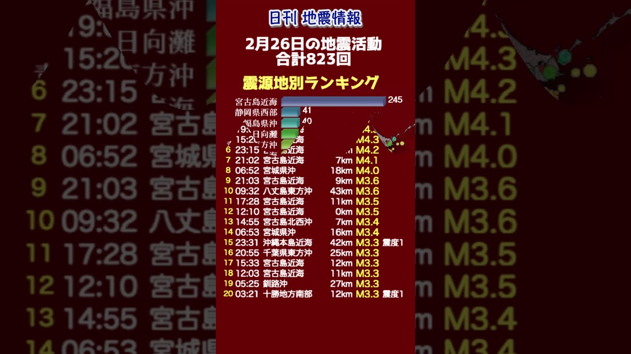 【地震情報】2月26日の地震活動 2026年2月26日の地震活動です。 気象庁より発表されます無感地震のデータを震源地ごとに集計しております。 #地震情報 #無感地震 #気象庁 2月26日NEWS地震情報宮古島気象庁無感地震震源情報
