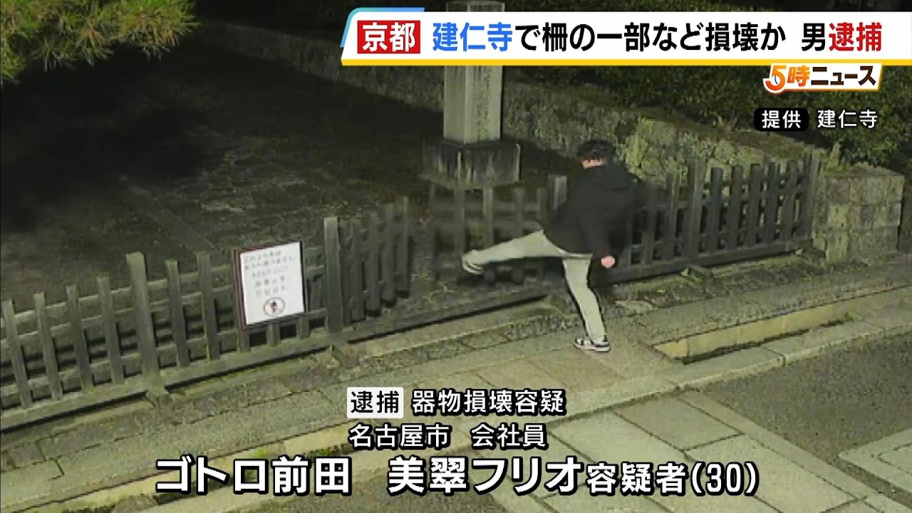 京都・建仁寺の柵の一部などを破壊した疑いで男を逮捕です。