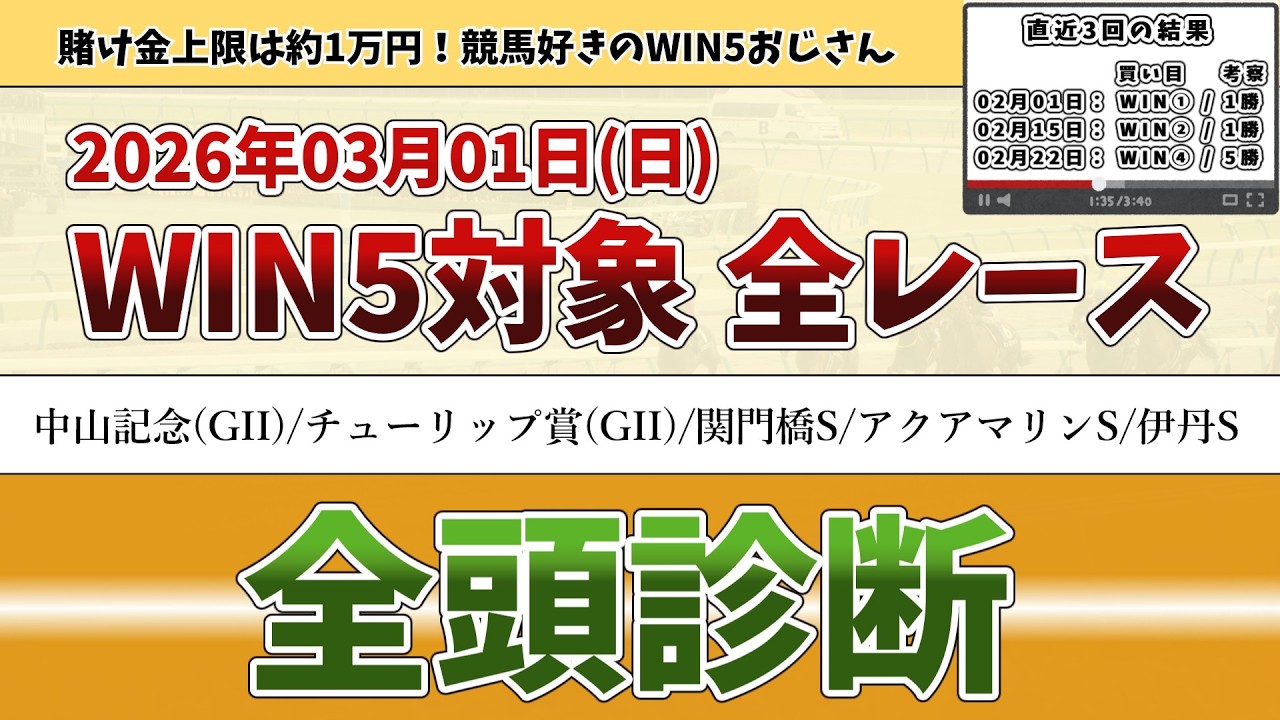 【WIN5対象全レース 全頭診断】2026年3月1日(日) WIN5対象レースの出走馬全頭を考察【WIN5おじさんの競馬予想】