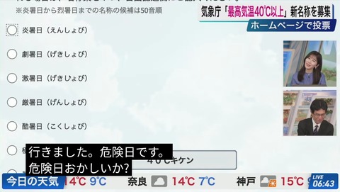 【悲報】ウェザーニュースのお姉さん、40℃以上の新名称に「危険日」と提案してコメ欄激震wwwwwwwww