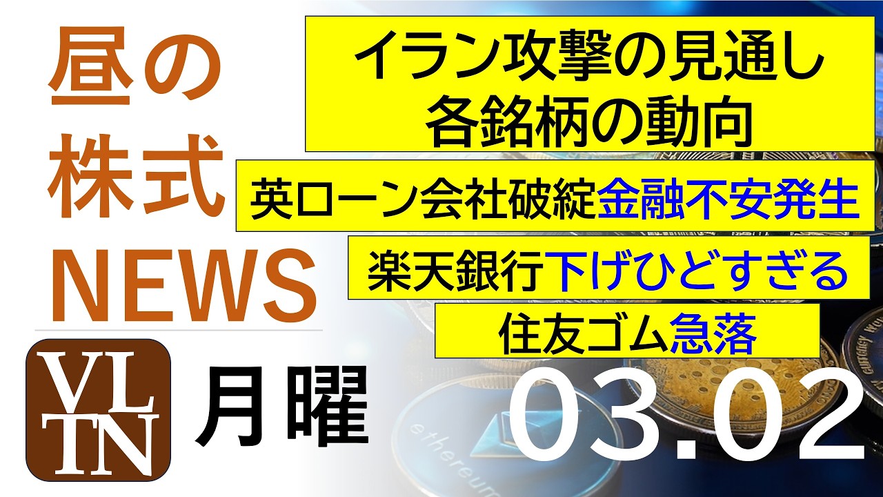 イラン攻撃の見通しと各銘柄の最新動向。イギリスのローン会社破綻で金融不安が発生。住友ゴム急落。楽天銀行下げひどい。2026年3月2日(月)~明日上がる株最新の日本株情報。高配当株の株価やデイトレ情報~