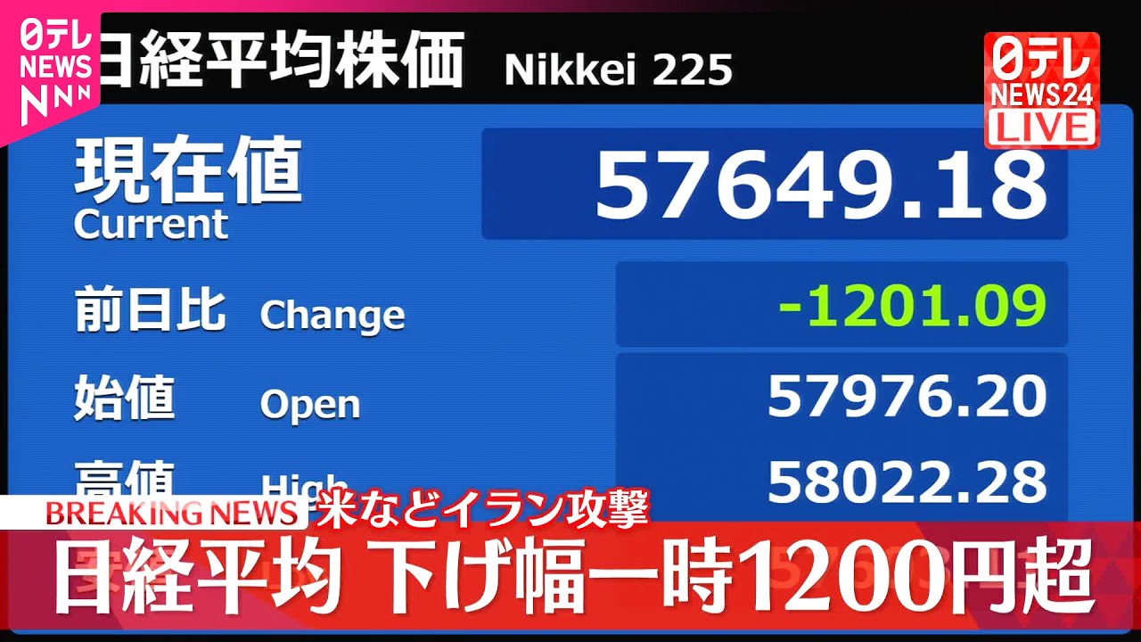 【速報】日経平均 下げ幅1200円超 アメリカなどイラン攻撃