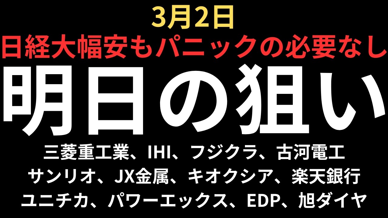 【日経大幅安もパニックの必要なし】チャートで見る明日の注目銘柄|三菱重工業、IHI、フジクラ、古河電工、サンリオ、JX金属、キオクシア、楽天銀行、ユニチカ、パワーエックス、EDP、旭ダイヤ