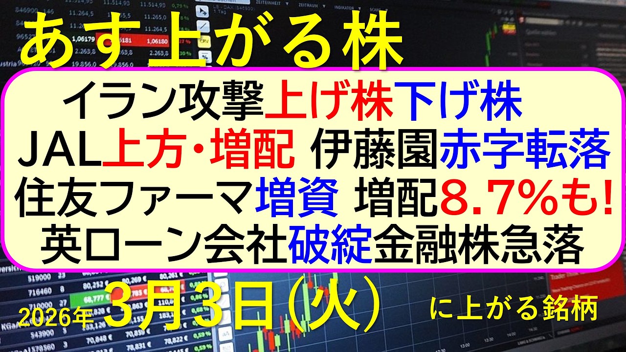 イラン攻撃上げ株下げ株。JAL上方・増配。住友ファーマ増資。増配8.7%!伊藤園赤字転落。金融株急落~あす上がる株 2026年3月3日(火)に上がる銘柄。最新の日本株情報。高配当株の株価やデイトレ情報