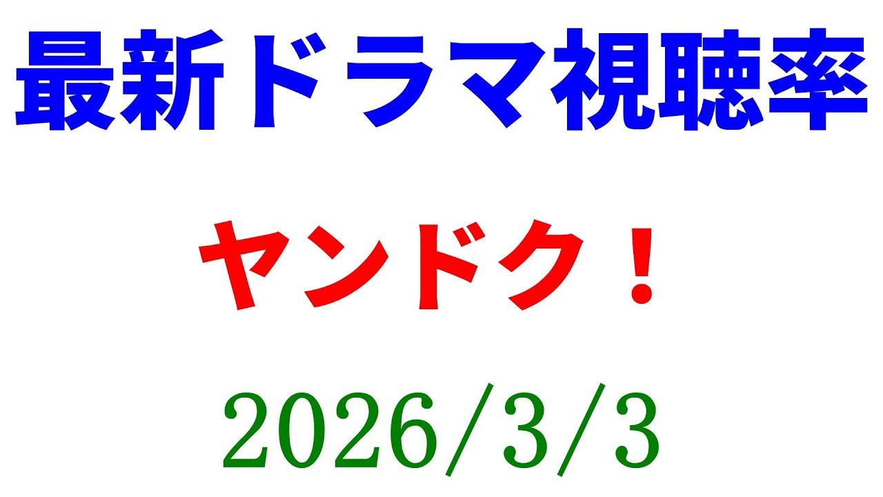 Share Facebook Twitter Pinterest LinkedIn ヤンドク! 視聴率下がる !視聴率速報☆2026年3月3日 ### ☆Amazon欲しいものリスト https://www.amazon.jp/hz/wishlist/ls/3MTQPTNTTWFUH?ref_=wl_share <ツイッター> https://twitter.com/KkReview このチャンネルのメンバーになって特典にアクセスしてください: https://www.youtube.com/channel/UC8I3iWxXV7Zqa5PpAeAlcFA/join dramaTVドラマテレビドラマドラマドラマ視聴率速報レビュー感想考察視聴率