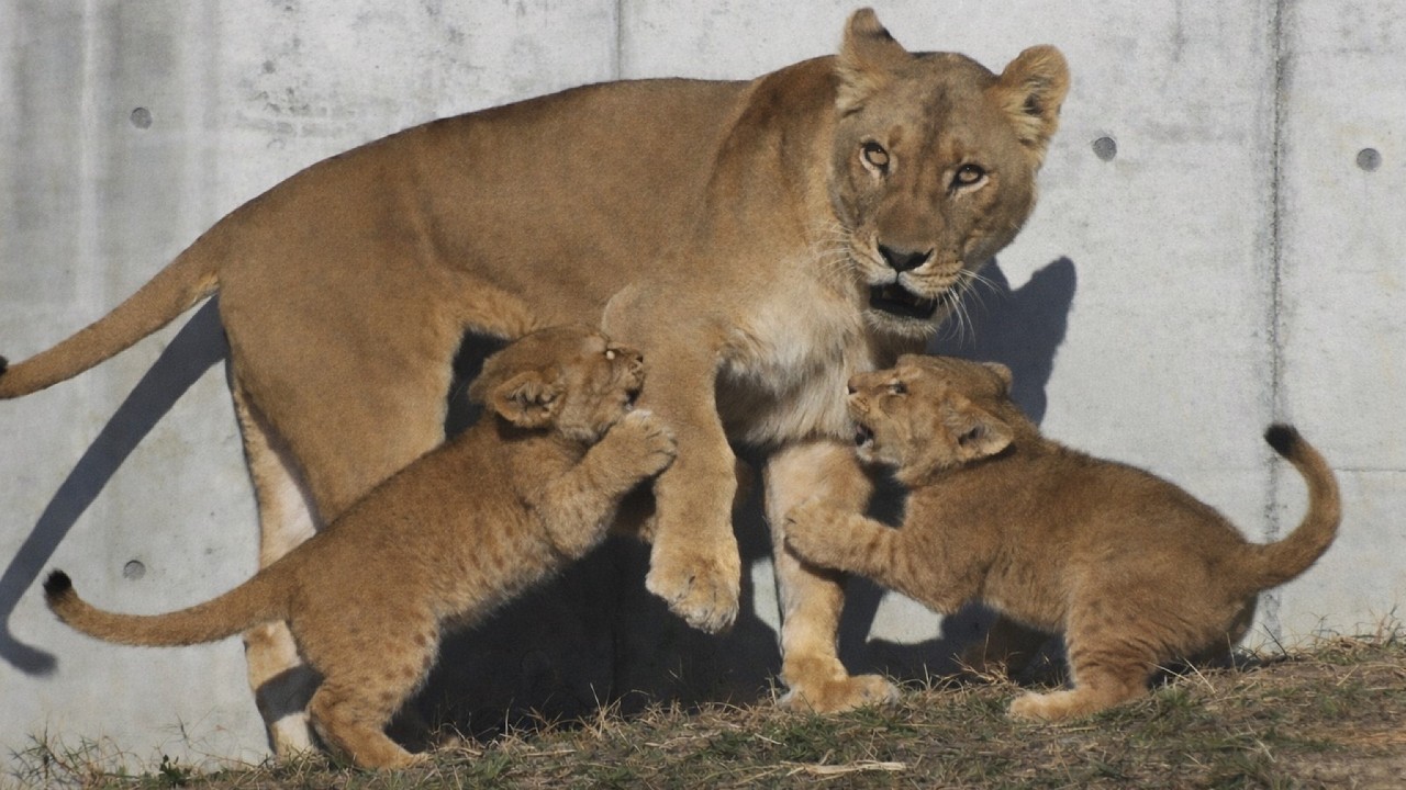 Three lion cubs pounce on their mother. They’re practicing hunting. One dashes forward, followed by the others leaping at their prey… Wwitnessed how wild lions hunt. Silk, great job teaching them how to hunt.