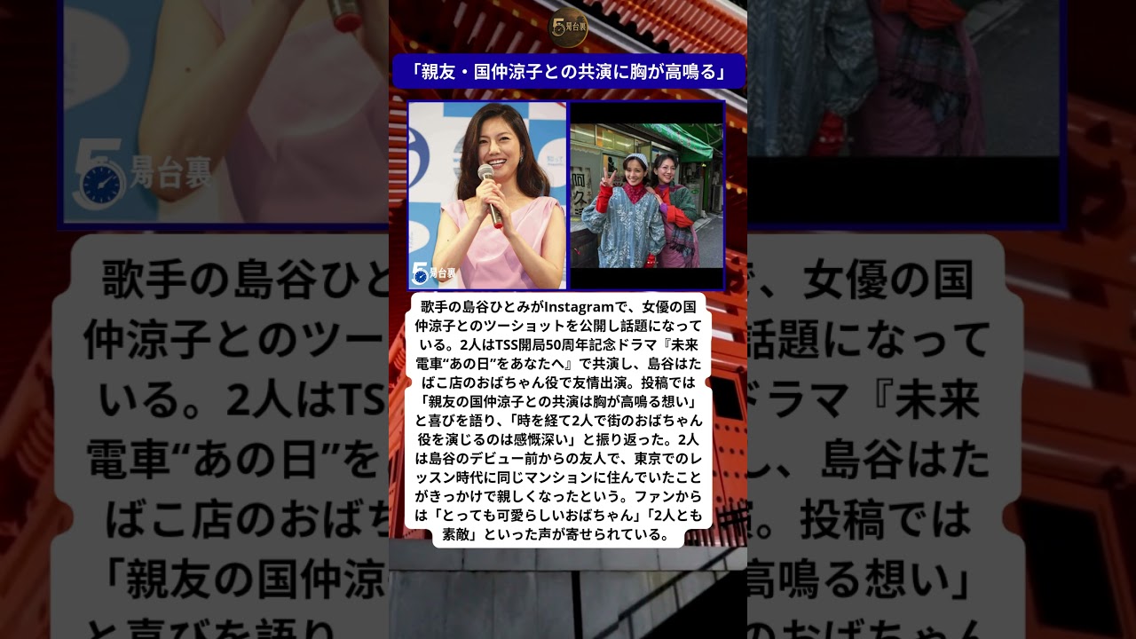 島谷ひとみが親友・国仲涼子とのドラマ共演ショットを公開。デビュー前から続く友情の2人が“おばちゃん役”で共演し、ファンからは「かわいい」「素敵」と絶賛の声が集まっている。