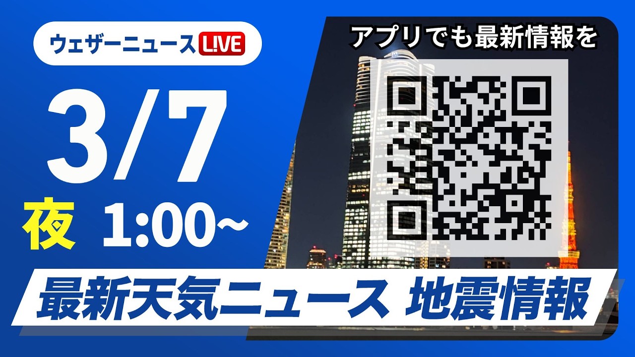 【ライブ】最新天気ニュース・地震情報 2026年3月7日(土) 1:00〜/北海道道東などで大雪 関東は気温上昇で花粉が大量飛散〈ウェザーニュースLiVE〉