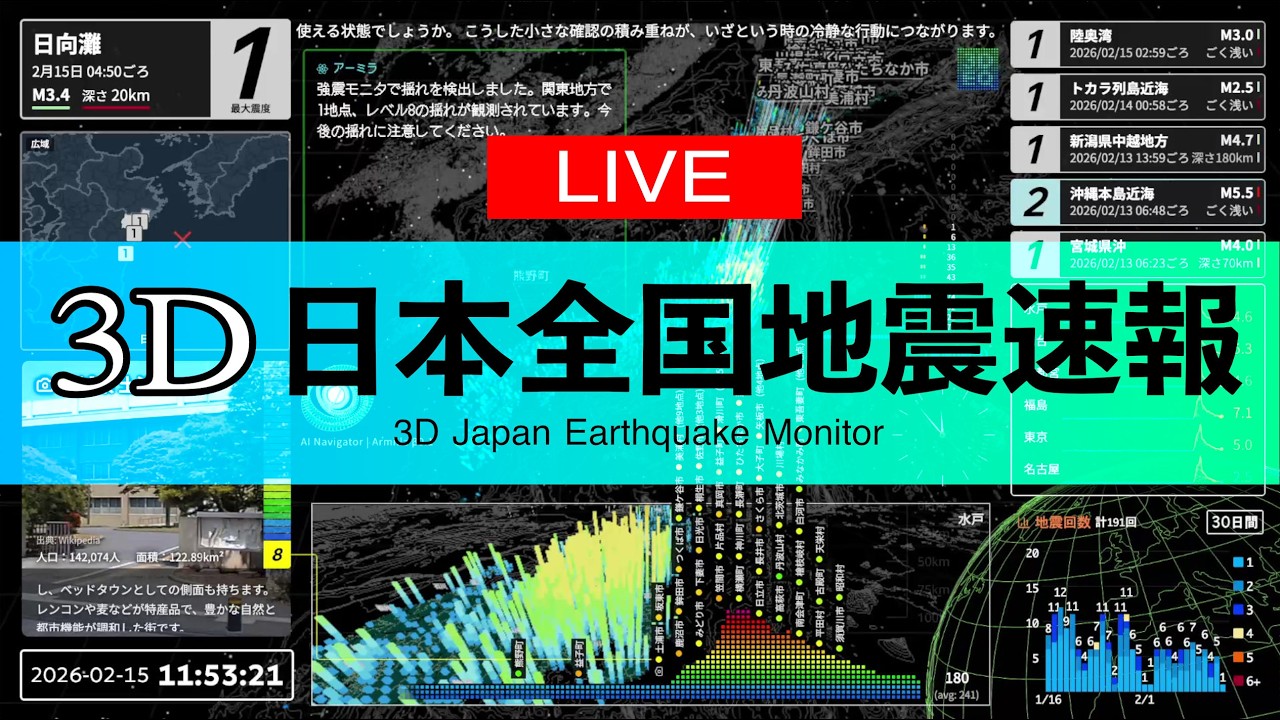 【地震速報ライブ】3D 日本全国地震速報 | 24時間配信(24/7 3D Japan Earthquake Monitor)
