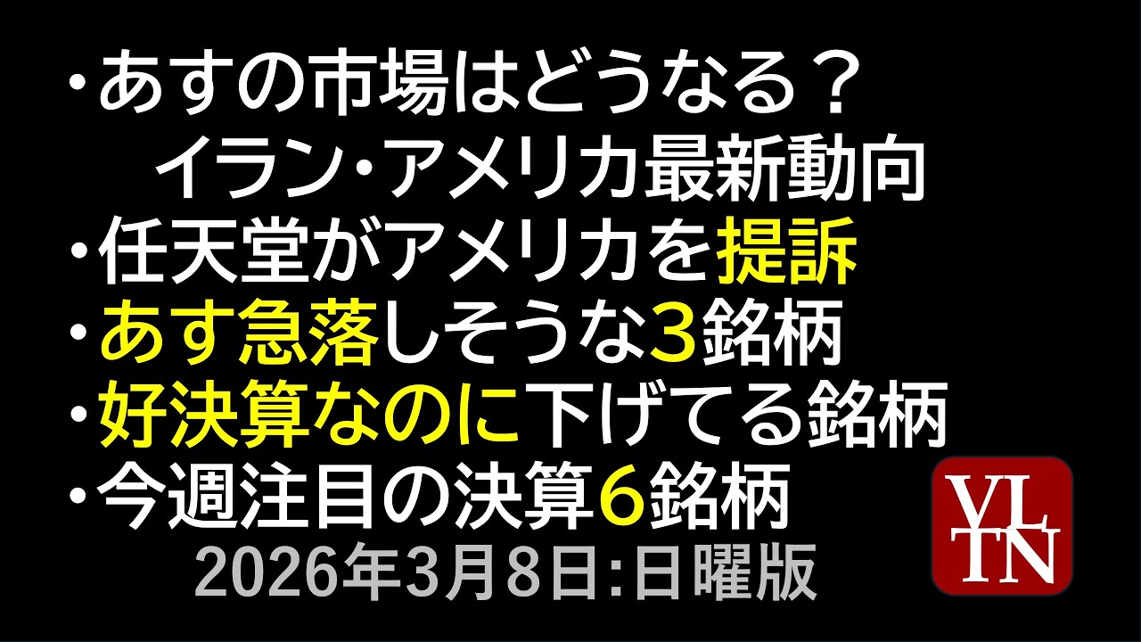 あすの市場はどうなる?イラン・アメリカ最新動向。任天堂がアメリカを提訴。あす急落しそうな3銘柄。好決算なのに下げてる銘柄。今週注目の決算6銘柄。3月8日:日曜版~あす上がる株。最新の日本株情報~