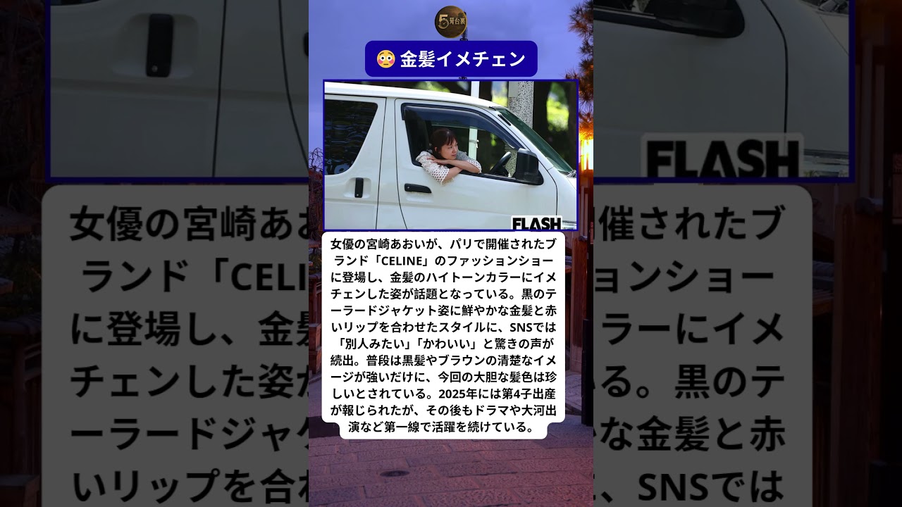 Share Facebook Twitter Pinterest LinkedIn 🎌 宮崎あおい大胆変身 女優・宮崎あおいがパリのCELINEファッションショーに登場し、金髪のハイトーンカラーへ大胆イメチェン。清楚な黒髪イメージからの変化にファン驚き。第4子出産後もドラマや大河など第一線で活躍を続ける姿に注目が集まっている。 celebrity宮﨑あおい