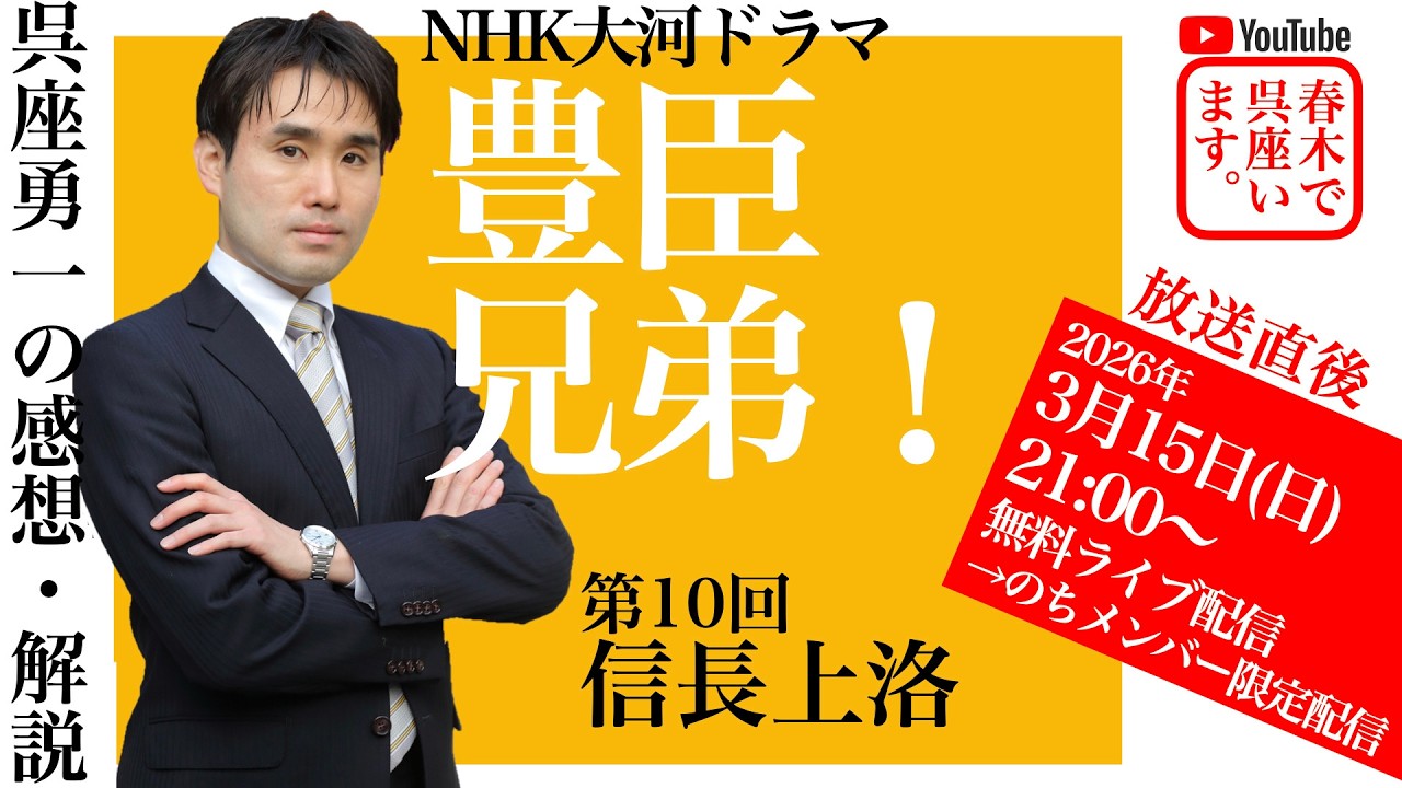 本日放送のNHK大河ドラマ『豊臣兄弟!』第10回「信長上洛」を、放送直後に歴史学者・呉座勇一が解説します。ドラマの時代背景を解説しつつ、感想を述べます。今後の展開の予測なども含め、視聴者の方からの活発なご質問・ご意見をお待ちしております。