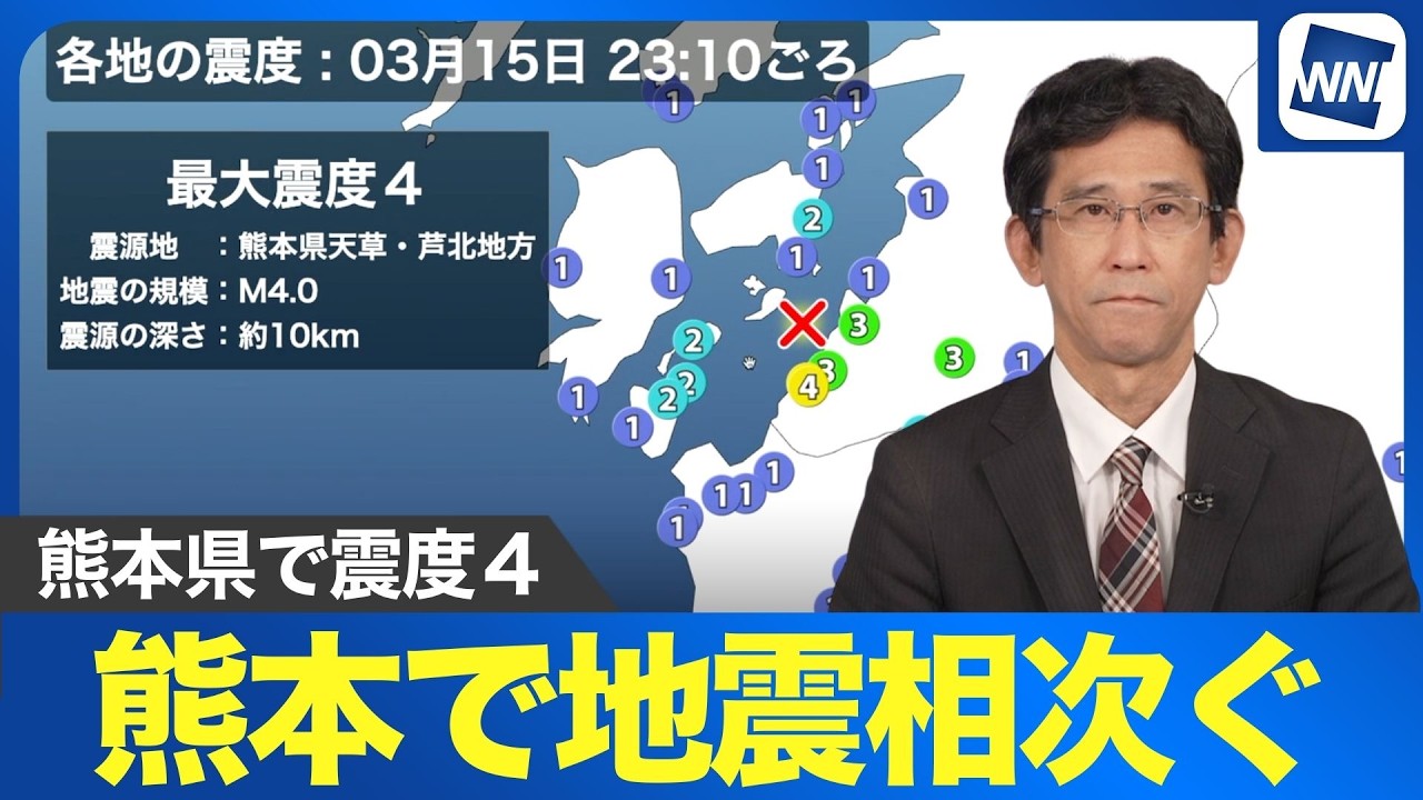 昨夜15日23時10分ごろ、熊本県天草・芦北地方(津奈木町沿岸付近)を震源とする最大震度4の地震が発生しました。