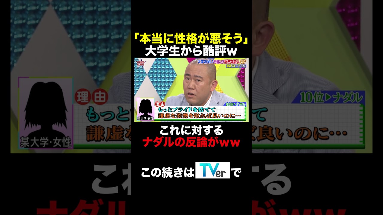 Share Facebook Twitter Pinterest LinkedIn 大学お笑いが選んだ好きな芸人GP 🏆#ロンドンハーツ #short 無料見逃し配信中‼️📺 https://tver.jp/episodes/epjm624h2od?utm_source=youtube.com&utm_medium=referral&utm_campaign=ex_londonhearts_0610 「本当に性格が悪そう…」 大学生から酷評を受けるナダル😨 「素人やもん」と強気の反論も、実際はダメージ大でダウン寸前🥊⁉️ #お笑い #バラエティ #ロンハー celebrity村上友梨