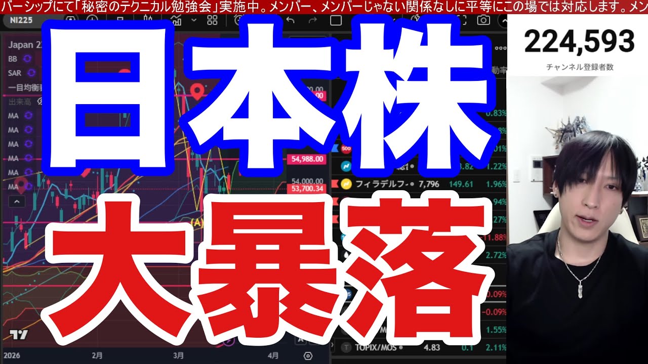 3/19【日経平均1900円大暴落‼】海外投資家も日本株4900億円売却‼中東情勢懸念でWTI原油高止まり。ドル円159円推移。利下げ期待後退で米国株、ナスダック、半導体株、仮想通貨下落