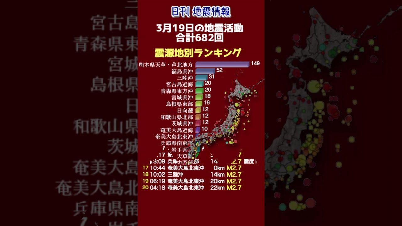 【地震情報】3月19日の地震活動 2026年3月19日の地震活動です。 気象庁より発表されます無感地震のデータを震源地ごとに集計しております。 #地震情報 #無感地震 #気象庁 3月19日NEWS地震情報気象庁無感地震震源情報