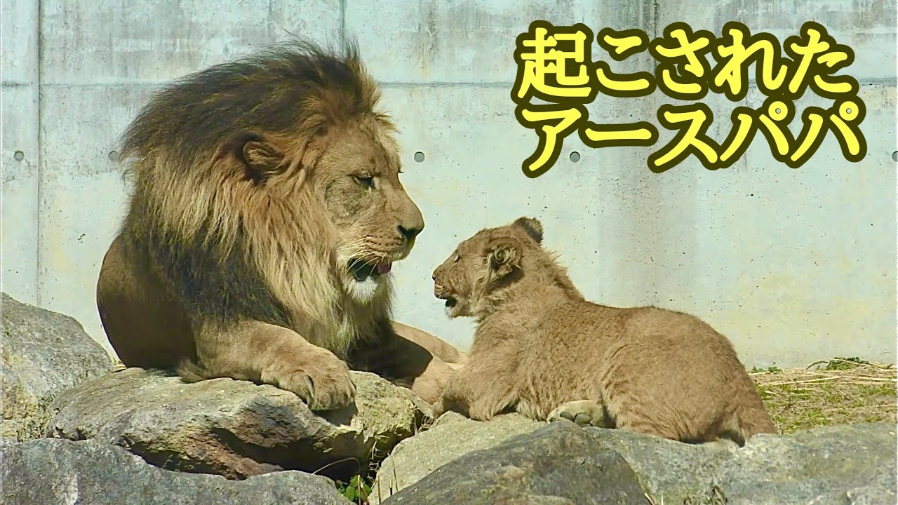 眠るアースパパ こどもに起こされる【のんほいパーク】Lion Earth Silk Den Al Vega Toyohashi Zoo