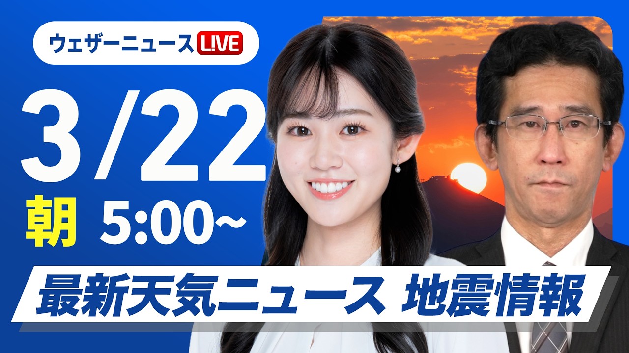 【ライブ】最新天気ニュース・地震情報 2026年3月22日(日)/三連休最終日は西から天気下り坂 関東は春の陽気〈ウェザーニュースLiVEモーニング・青原桃香/山口剛央〉
