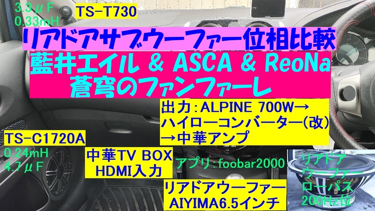 Share Facebook Twitter Pinterest LinkedIn リアドアサブウーファー位相比較/藍井エイル & ASCA & ReoNa – 蒼穹のファンファーレ 00:00 ①正 01:00 ②正 02:00 ③正 03:00 ④正 04:00 ⑤正 05:17 ①逆 06:17 ②逆 07:17 ③逆 08:17 ④逆 09:17 ⑤逆 ⭐リアドアサブウーファー位相比較⭐ ハイパス-12dB(正相):0dB(逆相) ※アンプローパス200Hz位あり ハイパスで時間ズレ🙇 正逆、違っていたら🙇 celebrity藍井エイル