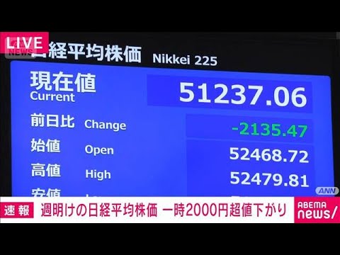 【速報】日経平均株価 一時2000円超下落 原油高で ホルムズ海峡の完全封鎖懸念(2026年3月23日)