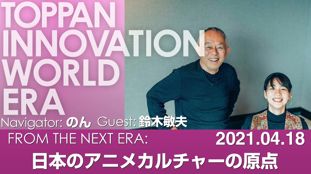 株式会社スタジオジブリ 代表取締役プロデューサー・鈴木敏夫さんをお迎えします。 雑誌『アニメージュ』から始まる日本のアニメカルチャーの原点からジブリ最新作の話題まで、たっぷりとお話を伺います。女優・創作あーちすと のんが、様々なジャンルのイノベーターをお迎えするトークセッション「FROM THE NEXT ERA」。対話の中からイノベーションの種を導き出します。 j-waveTOPPAN INNOVATION WORLD ERAアニメアニメージュエンターテインメントジブリスタジオジブリのんラジオ鈴木敏夫