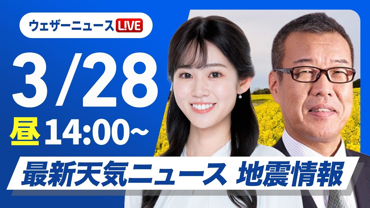 【ライブ】最新天気ニュース・地震情報 2026年3月28日(土) /広範囲で暖かなお花見日和 関東は折りたたみ傘を〈ウェザーニュースLiVEアフタヌーン・青原桃香/森田清輝〉