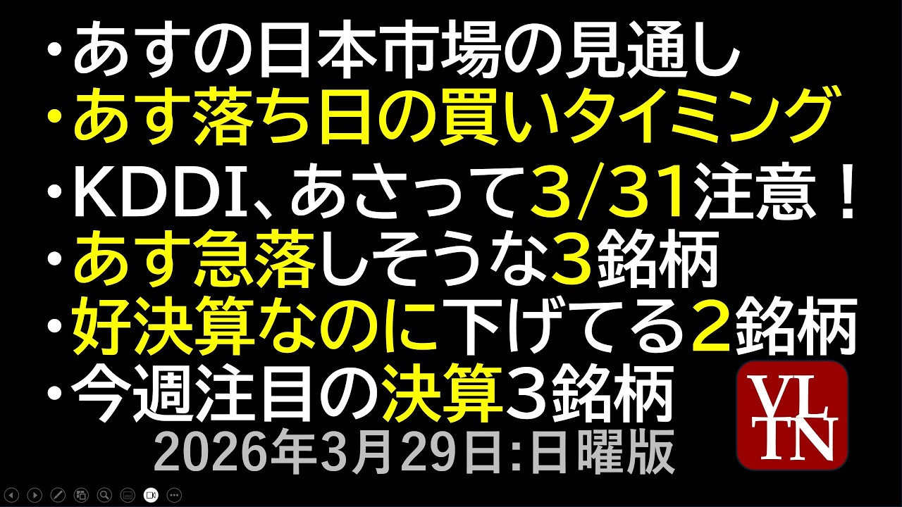 あすの日本市場の見通し。あす落ち日の買いタイミング。KDDI、あさって3/31注意!あす急落しそうな銘柄。好決算なのに下げてる銘柄。今週注目の決算。3月29日:日曜版~あす上がる株。最新の日本株情報~