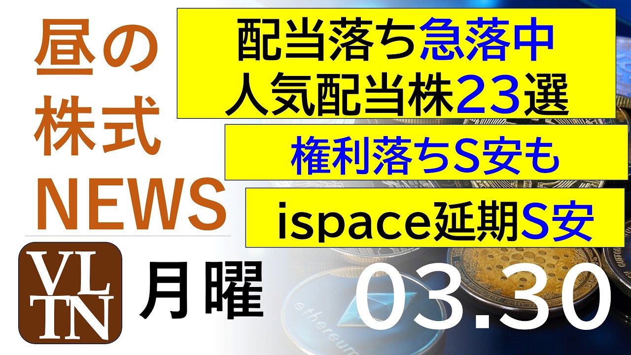 配当落ち急落中、人気配当株23銘柄。権利落ちでストップ安も発生。ispaceストップ安。2026年3月30日(月)~明日上がる株最新の日本株情報。高配当株の株価やデイトレ情報~