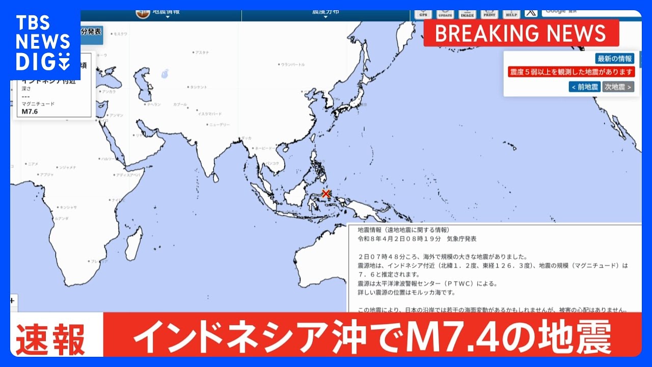 【速報】インドネシア・テルナテ沖のモルッカ海でM7.4の地震 日本の沿岸部で若干の海面変動予測も被害の心配なし|TBS NEWS DIG