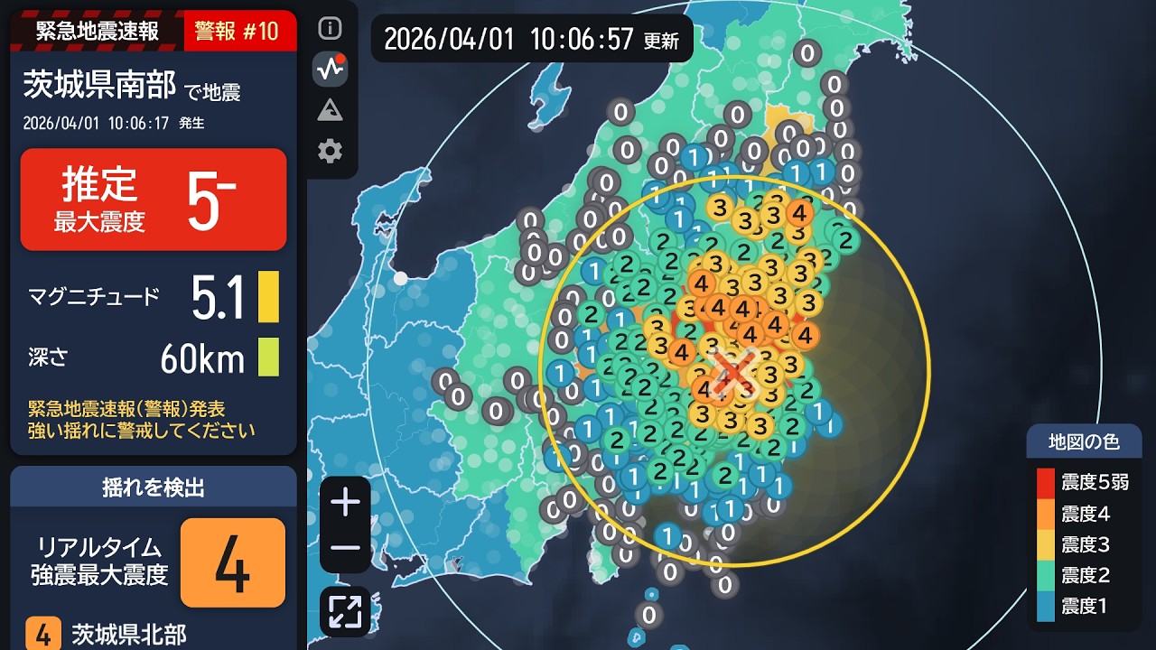 【緊急地震速報 (警報)】茨城県南部 最大震度5弱 M5.0 2026/04/01 10:06