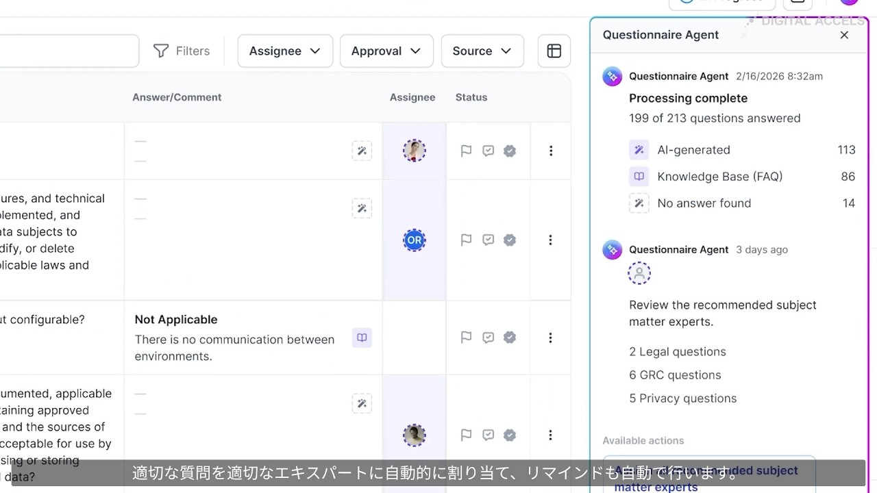 Drataの「エージェント型質問状回答」とは Drataの新機能がセキュリティー回答書作成の停滞を解消。AIによる回答案作成や専門家への自動割り当てで商談を加速させます。手動の追跡を不要にし、迅速なレビューでビジネスの勢いを維持します。 Drataの詳細はこちら https://digitalaccels.com/products/drata/ agentic aiAIAIQAartificial intelligenceDrataGRCSafeBaseエージェントエージェント型AIガバナンスコンプライアンスセーフベースセキュリティーレビューセキュリティー質問状ドキュメントドラータトラストセンターナレッジベースリスク人工知能生成監査