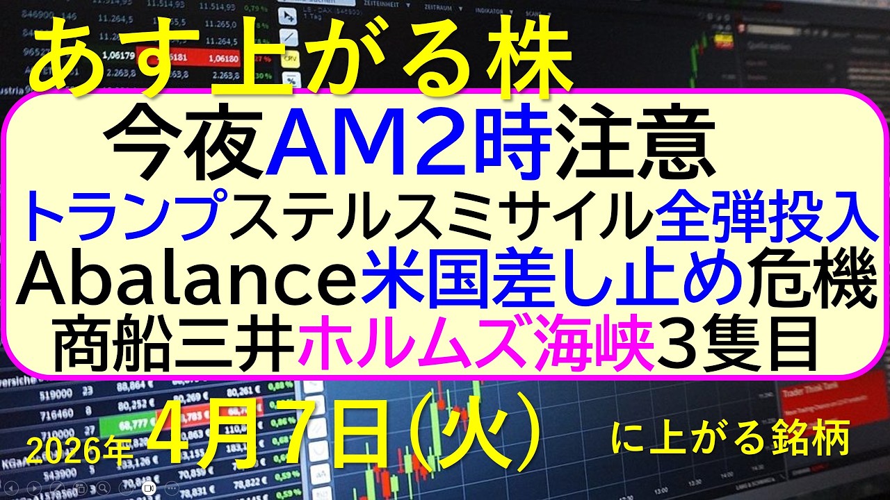 今夜AM2時注意!トランプ大統領、ステルスミサイル全弾投入。Abalance米国差し止め危機。~あす上がる株 2026年4月7日(火)に上がる銘柄。最新の日本株情報。高配当株の株価やデイトレ情報