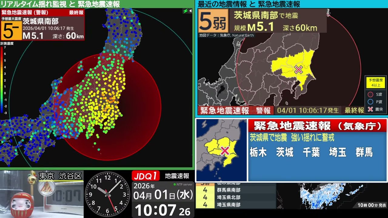 【強い地震】茨城県南部 震度5弱 M5.0(2026/4/1 10:06ごろ 切り抜きアーカイブ)