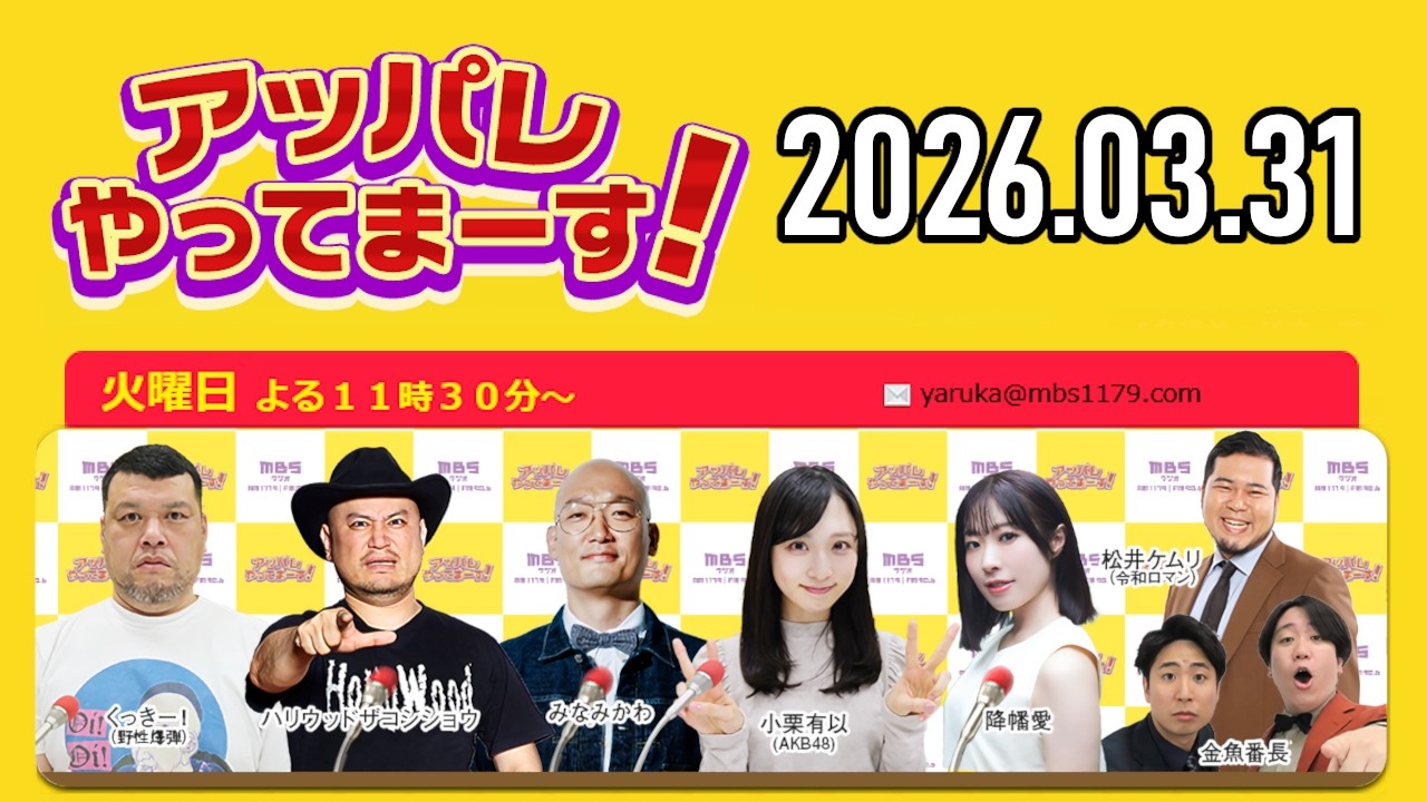 アッパレ火曜 2026年3月31日【くっきー!、ハリウッドザコシショウ、みなみかわ、金魚番長、小栗有以 (AKB48)、降幡愛】
