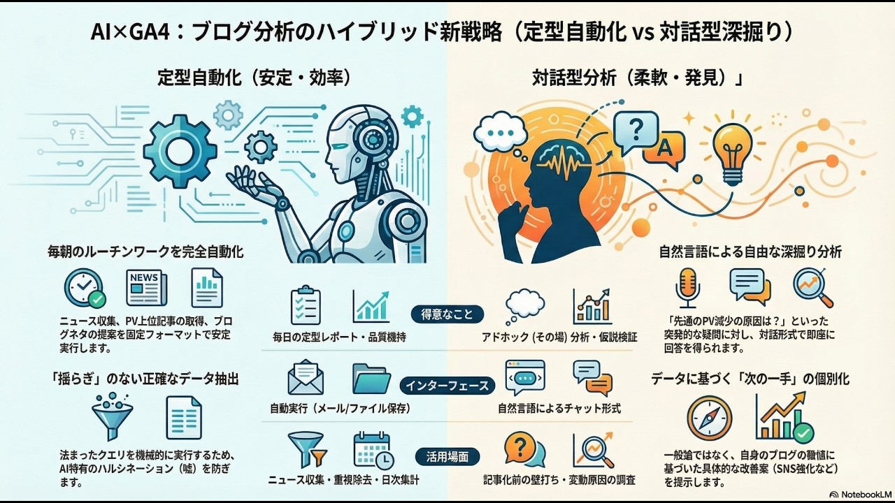 これまでのAI活用は、決まった時間にデータを収集する「自動化」が主流でした。しかし、本物のインサイト(洞察)を得るには、状況に合わせて柔軟にレシピを考える「対話型AI」の力が必要です。