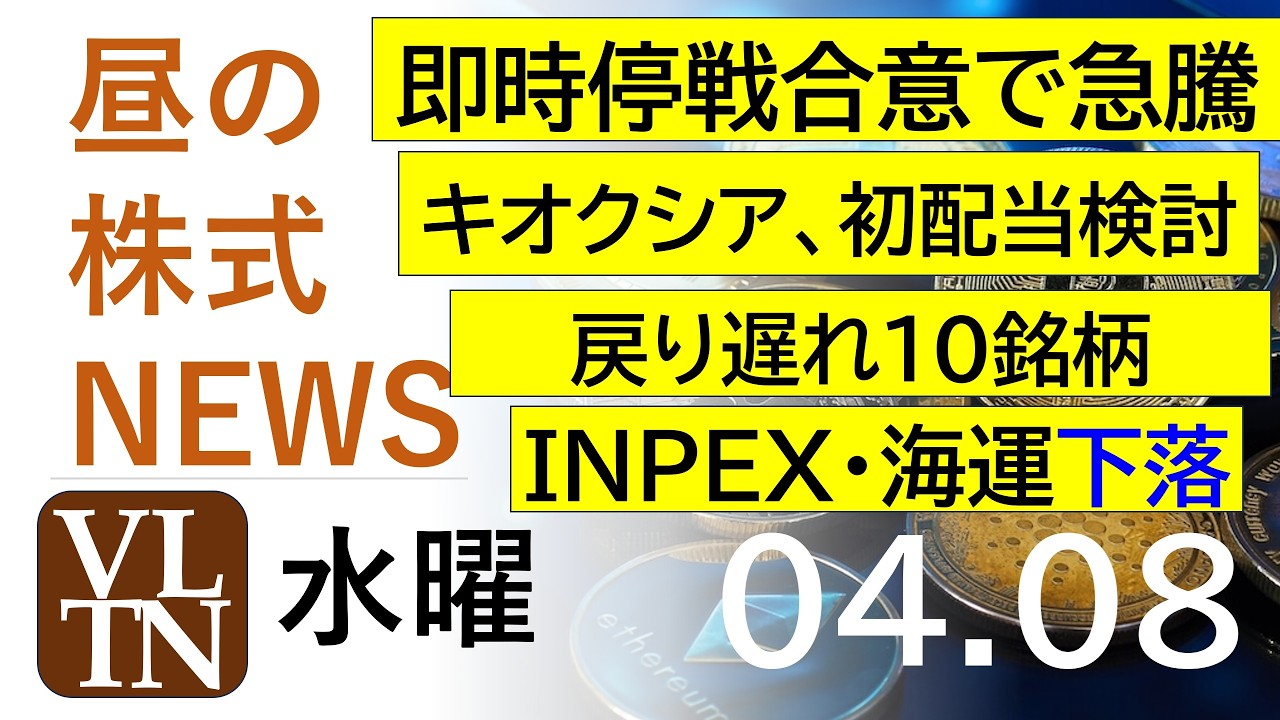 即時停戦合意で急騰。キオクシアが初配当検討。戻り遅れ10銘柄。INPEX・海運下落。2026年4月8日(水)~明日上がる株最新の日本株情報。高配当株の株価やデイトレ情報~