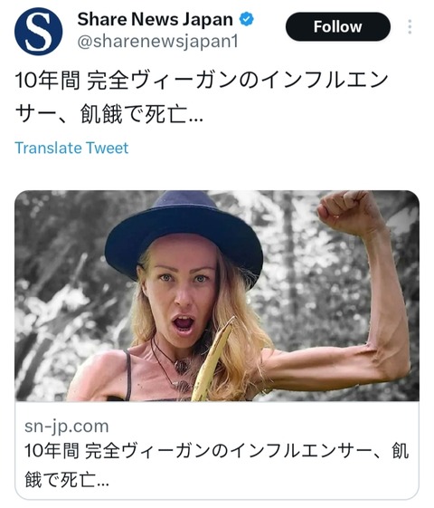 ロシア出身のヴィーガン系インフルエンサー、ジャンナ・サムソノワ(39歳)が、約10年間「生の果物と野菜だけを食べる生活」を続けた結果、2023年7月に餓死したことが明らかになりました。彼女は「ロー・ヴィーガン」として知られ、特に水を一切飲まず、医療機関の受診も拒否していました。 サムソノワはSNSで「Zhanna D’Art」という名前で活動し、インスタグラムでは1万人以上のフォロワーを持ち、健康効果を謳った投稿を行っていました。彼女は「果物とひまわりの芽、果物のスムージーとジュースだけを摂取する」とし、「私の体と心が毎日のように変化している」と信じ込んでいました。しかし、彼女の極端な食生活は健康を害し、最終的には命を落とす結果となりました。 彼女の母親は、サムソノワが「コレラのような感染症」で亡くなったと説明しており、極端な食事制限が症状を悪化させたと述べています。また、知人は彼女が数カ月前に非常に疲れて見え、リンパ液が漏れ出ていたと証言しています。治療を受けるよう説得されても、サムソノワはそれを拒否し続けました。 専門家によると、調理していない野菜ばかりの食事は、減量や心臓病の改善に役立つ可能性がある一方で、カルシウムやビタミンDの不足を招き、栄養失調、貧血、神経系の損傷、不妊などのリスクを高めることが指摘されています。この事件は、極端な食事法がもたらす危険性を再認識させるものであり、健康的な生活を送るためにはバランスの取れた食事が重要であることを示しています。 https://rapt-plusalpha.com/138914/