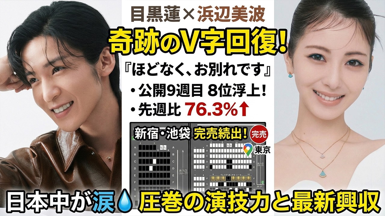 目黒蓮と浜辺美波が贈る感動作『ほどなく、お別れです』が公開9週目で驚異のV字回復を遂げました!新宿・池袋で完売が続出、先週比76.3%で8位に急浮上という快挙!日本中を涙させた圧巻の演技力と最新興行収入を速報でお届けします。Snow Manファン必見!