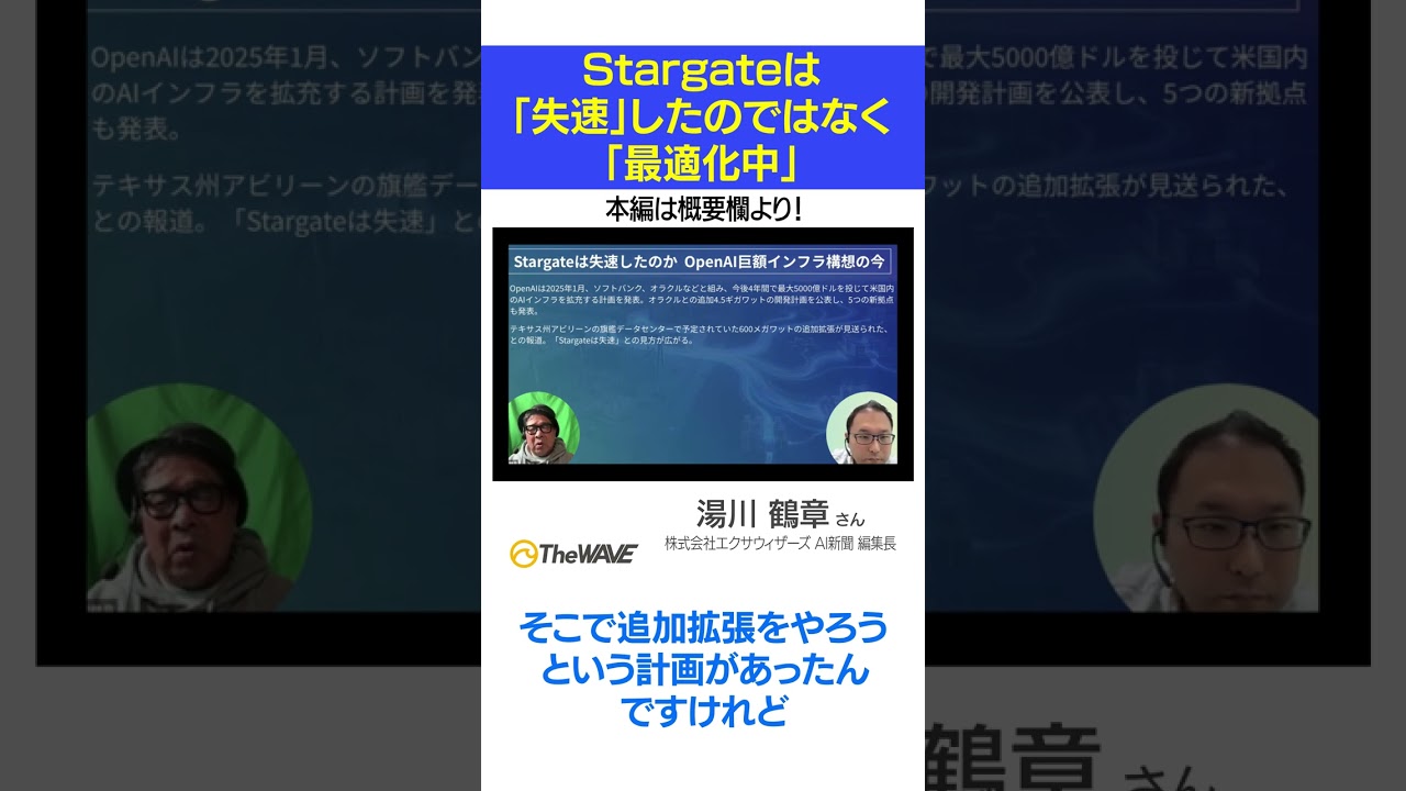 Stargateは「失速」したのではなく「最適化中」 #AI #shorts #shorts ▶︎本編はこちら 【週刊AI】企業向け自律型エージェントの登場は、組織にとってのシンギュラリティになる|計4トピックのニュースから読みとるAI業界の潮流 agentic aiAIartificial intelligenceエージェント型AI人工知能