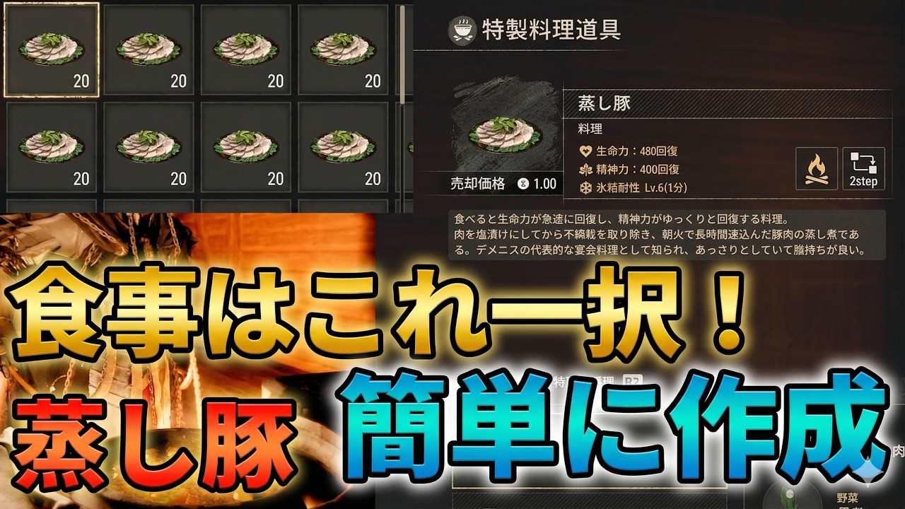 【紅の砂漠】体力480& 精神力400回復!蒸し豚を簡単に大量作成! 牛乳、脂の多い肉 ニンニク、塩、水の取り方も解説 キャンプの派遣で簡単に! クリムゾンデザート 攻略