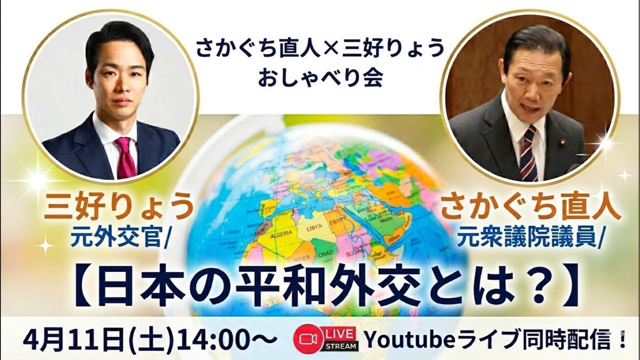 2026年4月11日、元れいわ新選組の国会議議員、さかぐち直人さんと平和外交についておしゃべり会を開催します。