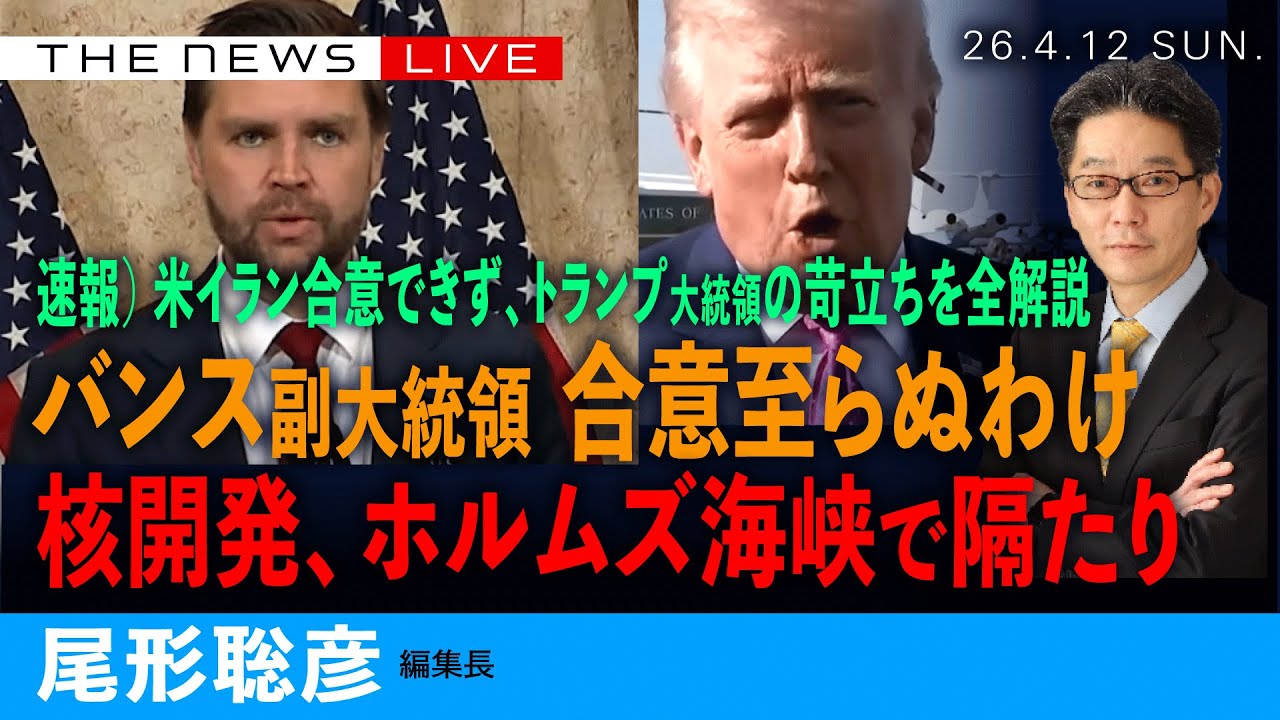 速報)米イラン、合意できず/バンス副大統領が語った、合意できぬ理由/トランプ大統領、募る苛立ち(尾形聡彦)【4/12(日) 11:45~ ライブ】