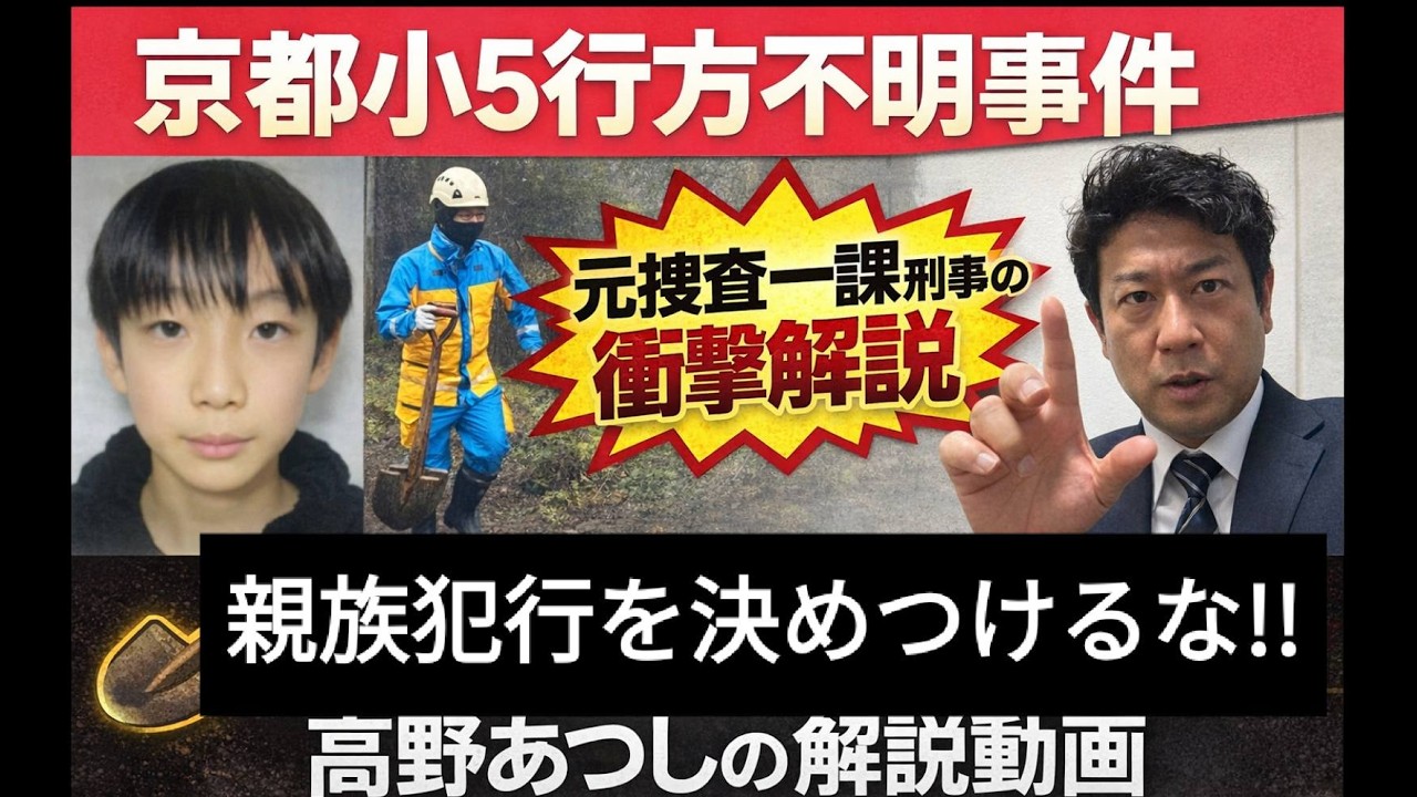 ミステリー京都小5行方不明事件、最新決定版解説!! 事件の状況を警察の動きから読み解く、元捜査一課刑事、インテリジェンス外交官ならではの、目からうろこの解説!! ネットでは親族犯行説が多く、警察OBで決めつけのような解説も多く、誰もが頭に浮かぶことかもしれませんが、現場での警察の動きを見ていると、決してその可能性は高くない!! celebrity最上もが